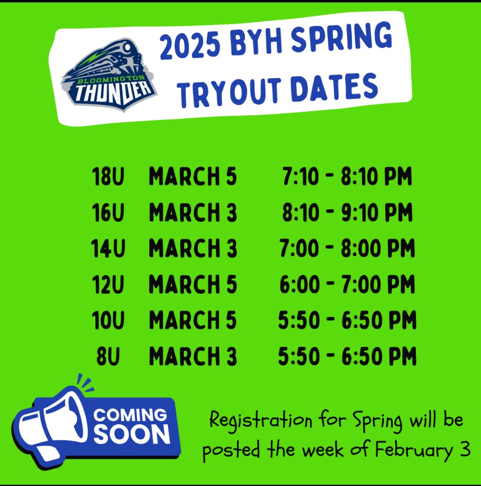 See photos for specific dates and times for BYH spring tryouts. There will be two spring tournaments. Both tournaments will be my hockey tournaments. Tournament dates are April 25-27 (Chicago spring classic) and May 16-18 (Windy City classic). This will include ALL age levels 8u-18u. These are “stay to play” tournaments.
